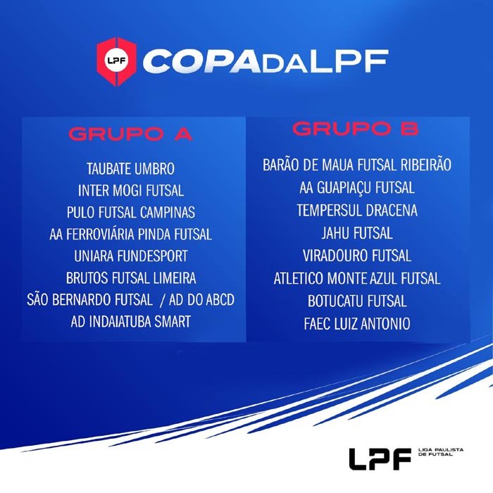 Confira as duas chaves: Grupo A - Uniara/Fundesport, Taubaté Umbro Futsal, São Bernardo Futsal/AD, Pulo Futsal Campinas, Brutos Futsal/Limeira, AA Ferroviária/Pinda, AD Indaiatuba/Smart e Inter Mogi Futsal.