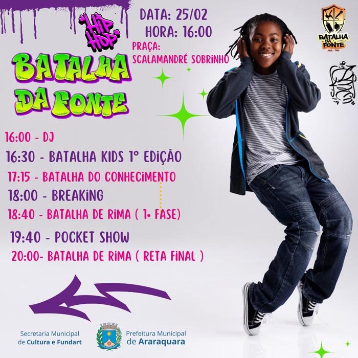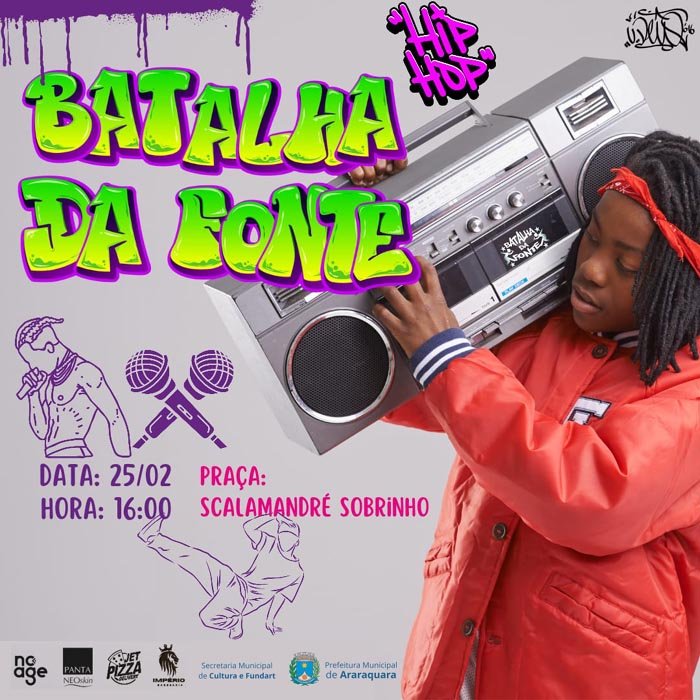A programação gratuita da Batalha da Fonte é realizada na Praça Scalamandré Sobrinho, localizada na Rua Mauro Pinheiro, s/nº, na Vila Ferroviária. Mais informações: (16) 98209-1755.