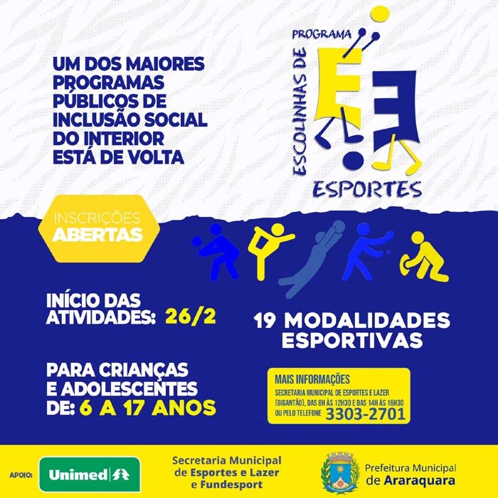 Na próxima segunda-feira (26), terão início as atividades das "Escolinhas de Esportes" da Prefeitura de Araraquara, um dos maiores programas públicos de inclusão social do interior. No Sesi, um dos parceiros do programa, as aulas já começaram no dia 15. Enquanto isso, as inscrições seguem abertas para crianças e adolescentes de 6 a 17 anos de idade, para 19 modalidades esportivas.