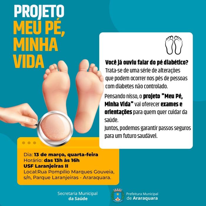 O projeto "Meu pé, minha vida" é uma iniciativa da própria equipe médica da USF Laranjeiras II. "O projeto visa seguir o que é preconizado pelo Ministério da Saúde, que determina a realização de exames e consulta médica de rotina semestral e consulta anual com oftalmologista com o propósito de amenizar os impactos pela diabetes na vida do indivíduo", explicou a enfermeira explicou a enfermeira Thais Fátima Aissa, uma das organizadoras da ação ao lado das outras integrantes da equipe médica.