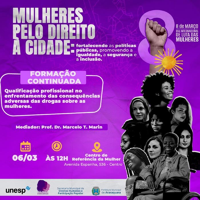 Mais tarde, às 12h, será realizada a formação continuada com as equipes técnicas do CRM e Casa das Margaridas, em um encontro que terá o tema "Qualificação profissional no enfrentamento das consequências adversas das drogas sobre as mulheres". A atividade, promovida em parceria com o Grupo PEnsAD/Curso de Farmácia/Unesp, terá mediação do Prof. Dr. Marcelo Marin e será realizada no Centro de Referência da Mulher, que fica na Avenida Espanha, 536, Centro.