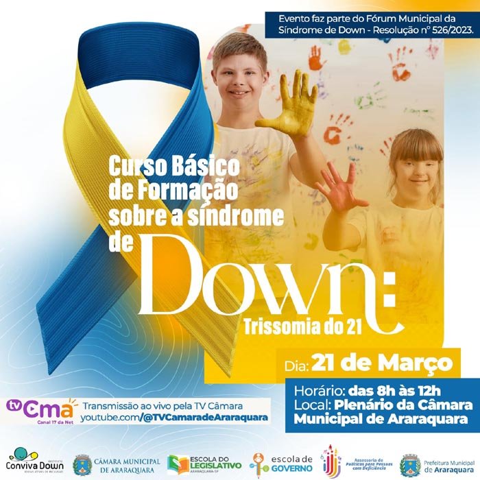 No dia 21 de março, quinta-feira da próxima semana, será realizado o "Curso Básico de Formação sobre a Síndrome de Down: Trissomia do 21". A capacitação será oferecida das 8h às 12h no Plenário da Câmara Municipal de Araraquara.