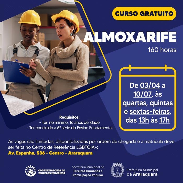 O curso de almoxarife será realizado de 3 a 10 de julho, às quartas, quintas e sextas-feiras, das 13h às 17h. As inscrições para este curso devem ser feitas presencialmente no Centro de Referência LGBTQIA+ (Av. Espanha, 536, Centro).
