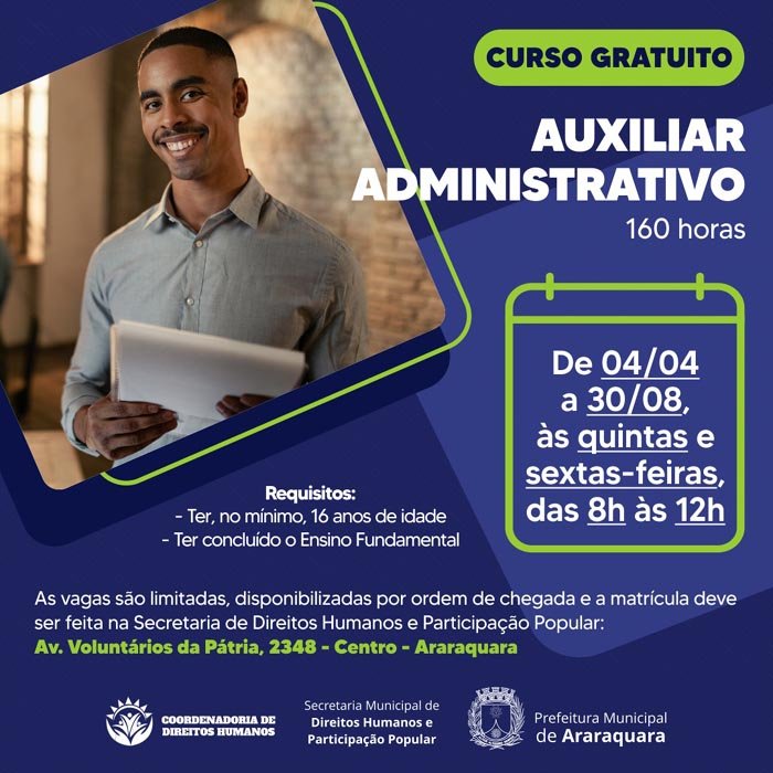 A Prefeitura de Araraquara, por meio da Coordenadoria de Direitos Humanos, que integra a Secretaria de Direitos Humanos e Participação Popular, abriu inscrições para os cursos gratuitos de almoxarife e auxiliar administrativo.