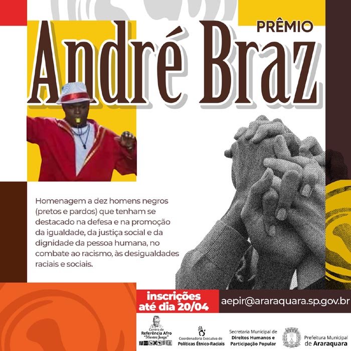 Estão abertas as indicações para a edição 2024 do Prêmio André Braz, premiação que homenageia anualmente dez homens negros – pretos e pardos –, que tenham se destacado na defesa e na promoção da igualdade, da justiça social e da dignidade da pessoa humana, no combate ao racismo, às desigualdades raciais e sociais. O prêmio tem como objetivo a valorização dos homenageados no contexto da cidadania.