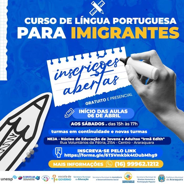 Após o sucesso de duas edições, realizadas no ano passado, o Curso de Língua Portuguesa para Imigrantes tem seus últimos dias inscrições para compor sua nova turma. As aulas serão realizadas de modo presencial aos sábados, das 15h às 17h, no Núcleo de Educação de Jovens e Adultos (NEJA) "Irmã Edith", que fica na Rua Voluntários da Pátria, 2154, Centro. As aulas terão início neste sábado (6) e as inscrições ficarão abertas até essa data.