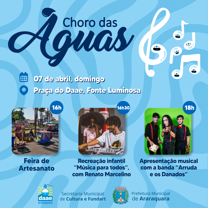 O Choro das Águas neste domingo, 07 de abril, apresenta programação cultural para toda família na Praça do Daae – Fonte Luminosa. Feira de Artesanato, atividade infantil e apresentação musical marcam a programação. Crianças, jovens e adultos podem se divertir com as atividades gratuitas realizadas pela Secretaria Municipal da Cultura e Fundart.
