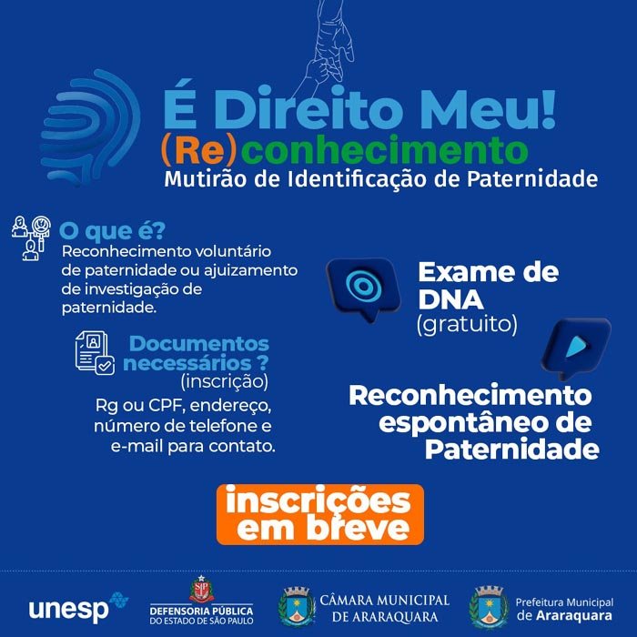 Para responder perguntas frequentes ligadas à paternidade de pessoas que buscam por identificação e reconhecimento legal, Araraquara vai realizar o primeiro "Mutirão de Identificação de Paternidade: É Direito Meu! (Re)conhecimento". A ação, que será desenvolvida por meio de uma parceria entre Prefeitura de Araraquara, Câmara Municipal, Defensoria Pública do Estado de São Paulo e Unesp, ainda não tem data definida e abrirá em breve suas inscrições.