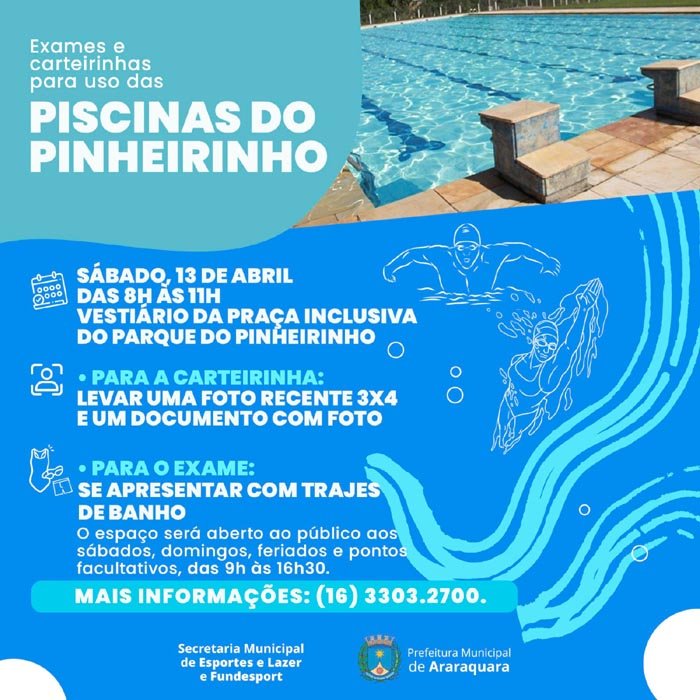 A Prefeitura de Araraquara, por meio da Secretaria Municipal de Esportes e Lazer, fará gratuitamente neste sábado (13), às 8h, a carteirinha e o exame médico para a utilização do complexo aquático do Parque Pinheirinho. O procedimento será realizado no novo vestiário da Praça Inclusiva do próprio parque.