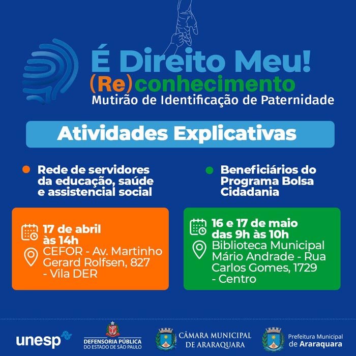Ainda em fase de desenvolvimento e sem data definida, o "Mutirão de Identificação de Paternidade: É Direito Meu! (Re)conhecimento" já tem duas atividades agendadas para levar explicações sobre seu sistema de atuação. O mutirão é desenvolvido por meio de uma parceria entre Prefeitura de Araraquara, Câmara Municipal, Defensoria Pública do Estado de São Paulo e Unesp, com o objetivo de responder perguntas frequentes ligadas à paternidade de pessoas que buscam por identificação e reconhecimento legal.