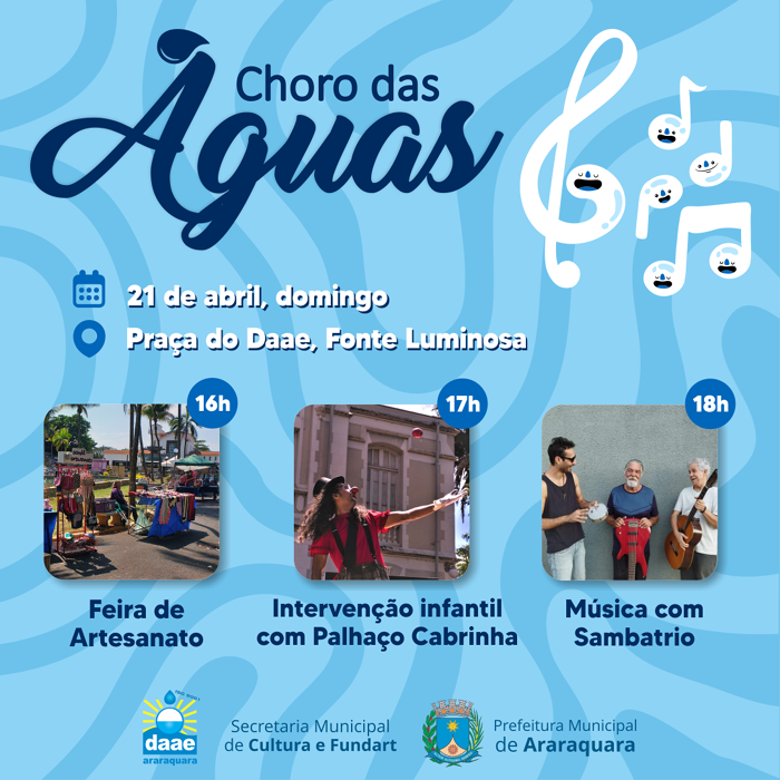 Domingo (21) o programa Choro das Águas, realizado pela Secretaria Municipal da Cultura e Fundart, apresenta atividades para toda a família na Praça do Daae – Fonte Luminosa: feira de artesanato, intervenção infantil e música.