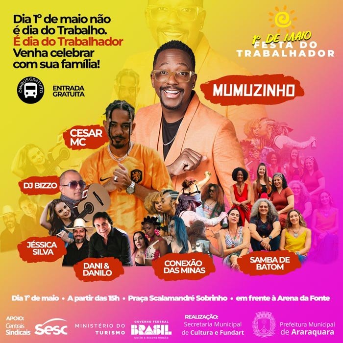 O cantor de samba e pagode Mumuzinho é a atração da tradicional Festa do Trabalhador de 2024. A programação totalmente gratuita para o feriado de 1º de maio foi anunciada nesta sexta-feira, dia 19 de abril, pelo prefeito Edinho em suas redes sociais. Além de shows, a festa conta com brinquedos infláveis, pipoca, algodão doce, atividades esportivas e culturais com monitoria. A realização é da Prefeitura de Araraquara, com apoio das Centrais Sindicais, do Sesc e do Governo Federal, via Ministério do Turismo.