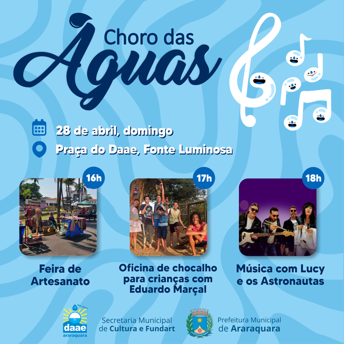 Domingo é dia do tradicional programa da Secretaria Municipal da Cultura e Fundart: o Choro das Águas. Na Praça do Daae – Fonte Luminosa, a partir das 16h, têm atividades gratuitas para toda a família.