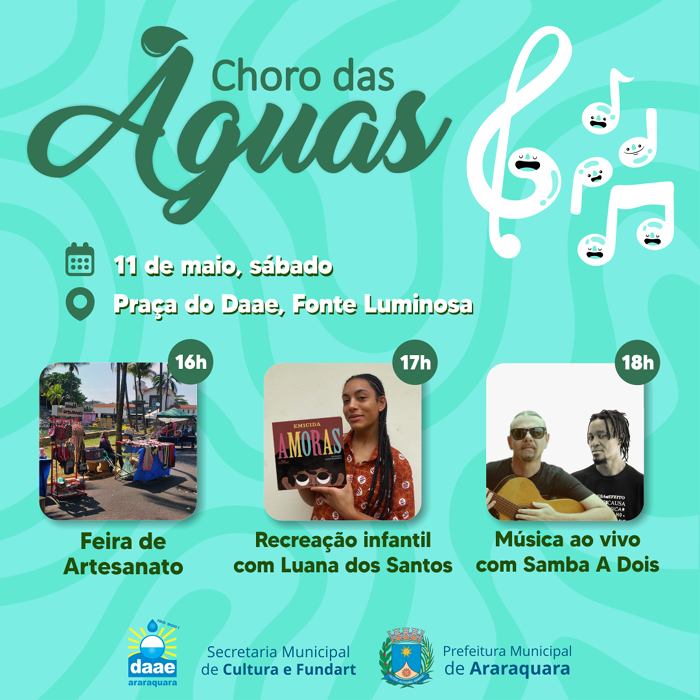 Atendendo a solicitação dos artesãos e artistas que participam da programação do Choro das Águas, a Secretaria Municipal da Cultura e a Fundart anteciparam a programação que seria realizada no Dia das Mães, para este sábado, 11 de maio, na Praça do Daae – Fonte Luminosa.