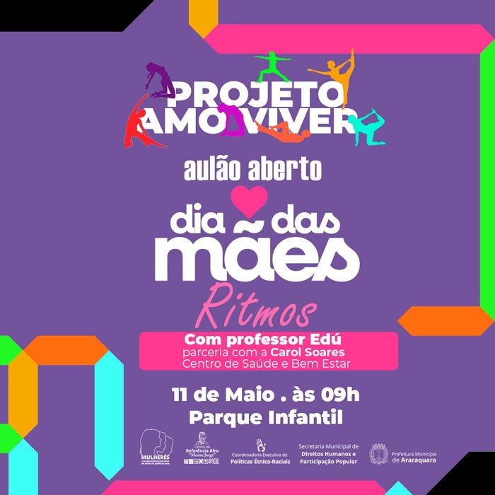 Neste sábado (11), o Parque Infantil receberá o aulão aberto de ritmos do projeto "Amo Viver", com o propósito de celebrar o Dia das Mães, que neste ano se comemora no dia 12. Conduzida pelo professor Flávio Eduardo Luiz, o Edu, a atividade é realizada por meio de uma parceria da Prefeitura, por meio do Centro de Referência Afro "Mestre Jorge", Casa SP Afro Brasil "Oswaldo da Silva Bogé", Coordenadoria de Políticas Étnico-Raciais e Coordenadoria de Políticas para Mulheres, com Carol Soares, do Centro de Saúde e Bem Estar.