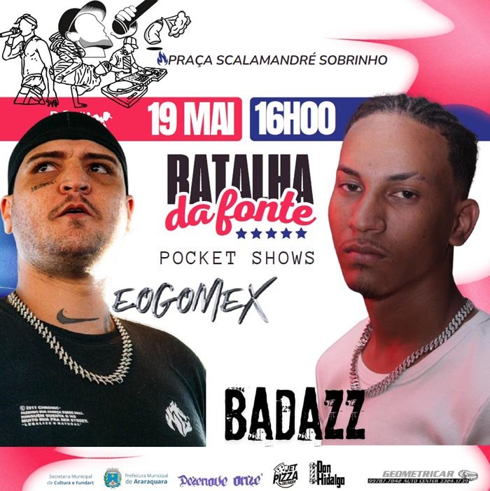 A Batalha da Fonte neste domingo, 19 de maio, conta com premiação da Batalha de Rimas do tipo Bate e Volta, além de breaking, DJs e pocket shows com Gomex e Badazz. As atividades gratuitas realizadas pela Secretaria Municipal da Cultura e Fundart têm início às 16 horas.