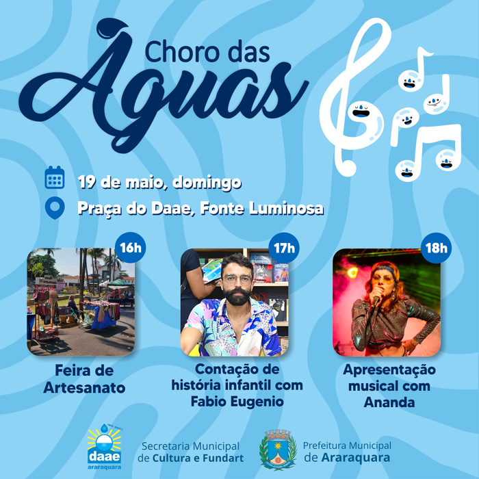 A diversão está garantida neste domingo (19) com a programação para toda a família do Choro das Águas. As atividades na Praça do Daae apresentam: feira de artesanato, contação de história infantil com Fabio Eugenio e música com Ananda, a partir das 16 horas. A programação gratuita é uma realização da Prefeitura de Araraquara, por meio da Secretaria Municipal da Cultura e Fundart.