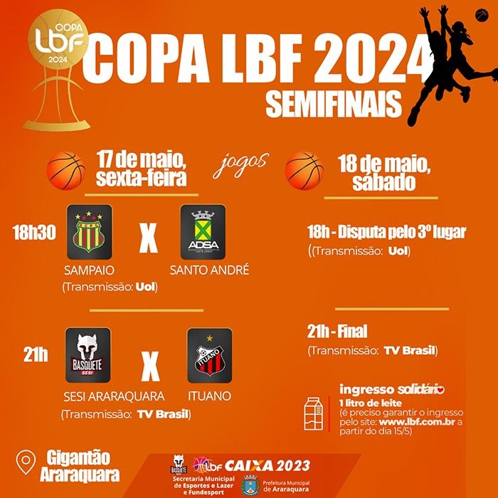 A Liga de Basquete Feminino (LBF) abriu nesta quarta-feira (15) a reserva de ingressos para a 1ª Copa LBF Caixa, que será realizada no Ginásio de Esportes "Castelo Branco", o Gigantão, em Araraquara, nesta sexta-feira (17) e sábado (18). A competição terá entrada solidária: é preciso garantir o ingresso antecipadamente pela internet. No dia do jogo, será feita a troca com a doação de um litro de leite, que será revertido ao Fundo Social de Solidariedade em prol de famílias em situação de vulnerabilidade da cidade.