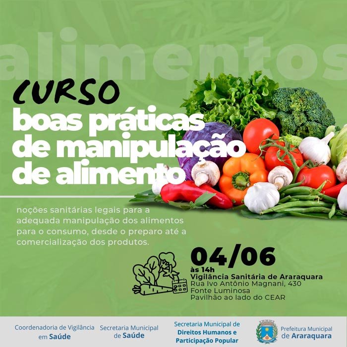 Na próxima terça-feira (4), às 14h, a sede da Vigilância Sanitária de Araraquara (Rua Ivo Antônio Magnani, 430, no pavilhão ao lado do Cear) receberá o curso de boas práticas de manipulação de alimentos, que será oferecido pela Prefeitura de Araraquara por meio da Coordenadoria de Vigilância em Saúde, que integra a Secretaria Municipal de Saúde, e da Secretaria Municipal de Direitos Humanos e Participação Popular.