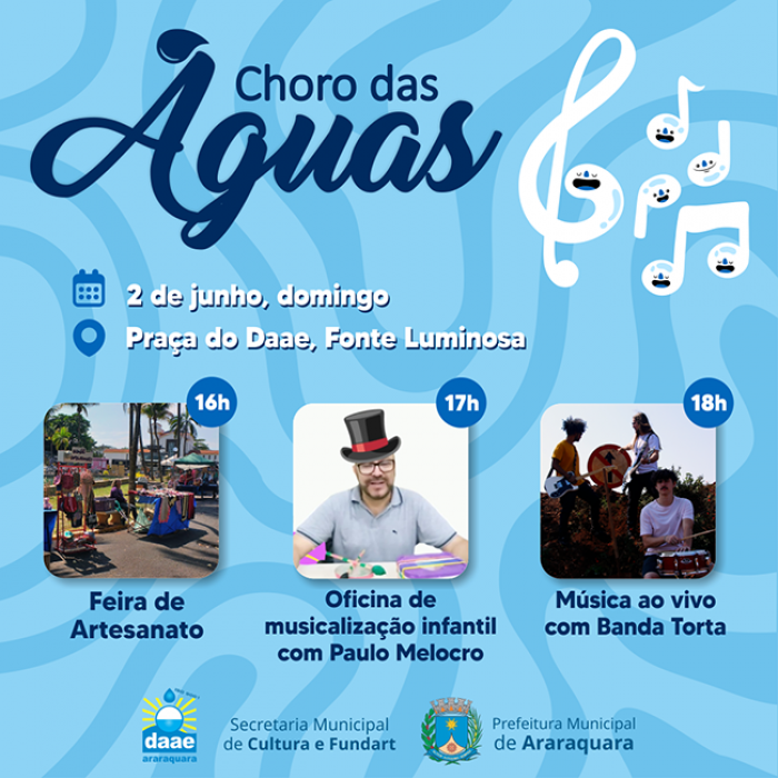 A programação do Choro das Águas conta ainda com: oficina de musicalização infantil com Paulo Melocro (17h) e o show musical com a Banda Torta (18h), com músicas autorais e covers. Com influências que vão do MPB, rock psicodélico, funk, soul, baião até a música caipira, a Torta cria um som inovador transcendendo as categorias convencionais.