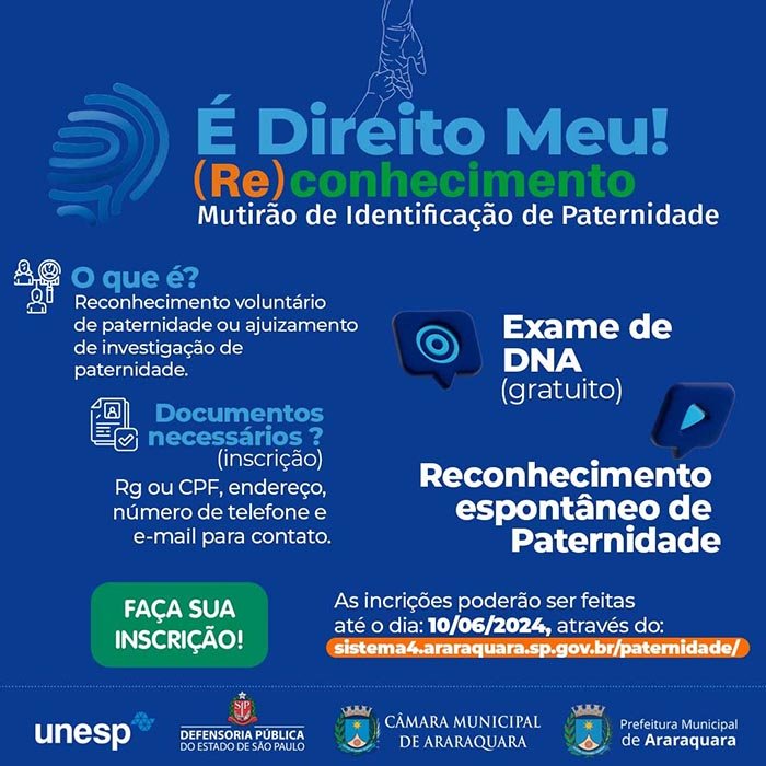 Teve início nesta quarta-feira (29), as inscrições para os interessados em participar do "Mutirão de Identificação de Paternidade: É Direito Meu! (Re)conhecimento", que será realizado em Araraquara no dia 15 de junho, às 8h, na sede da Defensoria Pública do Estado de São Paulo (Rua São Bento, 1725, Centro), por meio de uma parceria entre Prefeitura, Câmara Municipal, Defensoria Pública do Estado de São Paulo e Unesp. As inscrições podem ser feitas até o dia 6 de junho pelo link http://sistema4.araraquara.sp.gov.br/paternidade/ ou na página principal do site da Prefeitura: www.araraquara.sp.gov.br.