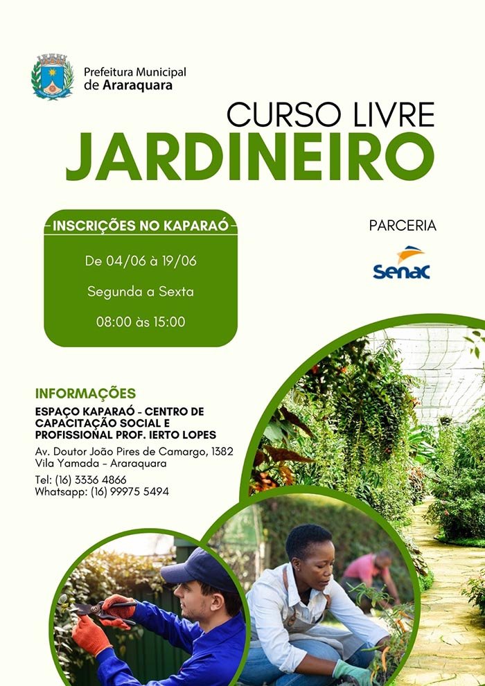 O Espaço Kaparaó, Centro de Capacitação Social e Profissional “Prof. Ierto Lopes”, ligado à Coordenadoria Executiva do Trabalho e de Economia Criativa e Solidária da Secretaria Municipal de Trabalho, Desenvolvimento Econômico e Turismo, está com inscrições abertas para 30 vagas no curso livre gratuito de Jardineiro, que será oferecido Senac Araraquara, em parceria com a Prefeitura de Araraquara.