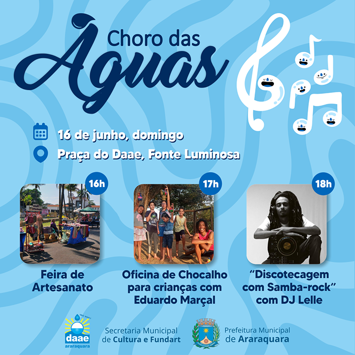 A programação do Choro das Águas conta ainda com: recreação infantil com a oficina de chocalho com Eduardo Marçal (17h) e apresentação musical “Discotecagem com Samba-rock” com DJ Lelee (18h). Mais informações nas Notícias do site da Prefeitura de Araraquara.