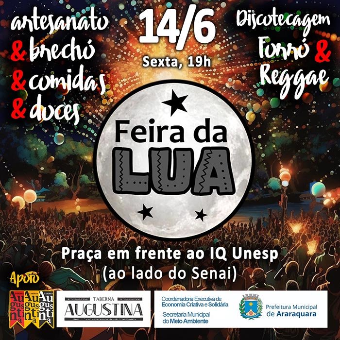 A Feira da Lua, realizada pelo Coletivo Pôr do Sol, agita a Praça em frente ao IQ – Instituto Química Unesp nesta sexta-feira, das 18h às 22h, com aproximadamente 20 expositores, entre: artesanato, praça de alimentação, brechó e música. Pipoca e vinho quente também estão garantidos! Atenção que a discotecagem com reggae e forró promete animar a festa!