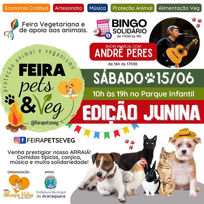 A Feira Pets & Veg realiza uma edição especial de festa junina e convida a todos para participarem da festa com traje junino! É neste sábado, no Parque Infantil, das 10h às 17 horas, com organização da ONG Abraça Vidas Araraquara