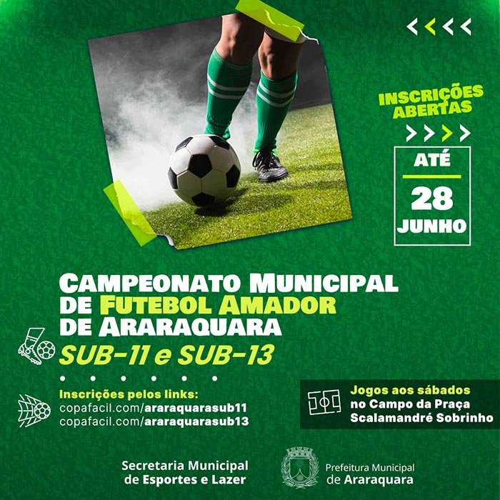 A Prefeitura de Araraquara, por meio da Secretaria Municipal de Esportes e Lazer, abriu as inscrições para o Campeonato Municipal de Futebol Amador nas categorias sub-11 e sub-13, que têm por finalidade promover o intercâmbio social e esportivo, além de desenvolver a modalidade na cidade, estimulando a prática esportiva.