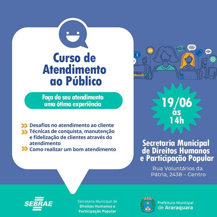Atividade realizada pela Prefeitura de Araraquara, por meio da Secretaria Municipal de Direitos Humanos e Participação Popular, em parceria com o Sebrae, o Curso de Atendimento ao Público, que tem como público-alvo os imigrantes que irão participar da Feira das Nações, sofreu uma alteração em sua data. À princípio, seria realizada no dia 5 de junho, porém foi adiada e acontecerá nesta quarta-feira (19), às 14h. O local também foi alterado e será na sede da Secretaria de Direitos Humanos e Participação Popular, que fica na Rua Voluntários da Pátria, 2438, Centro.
