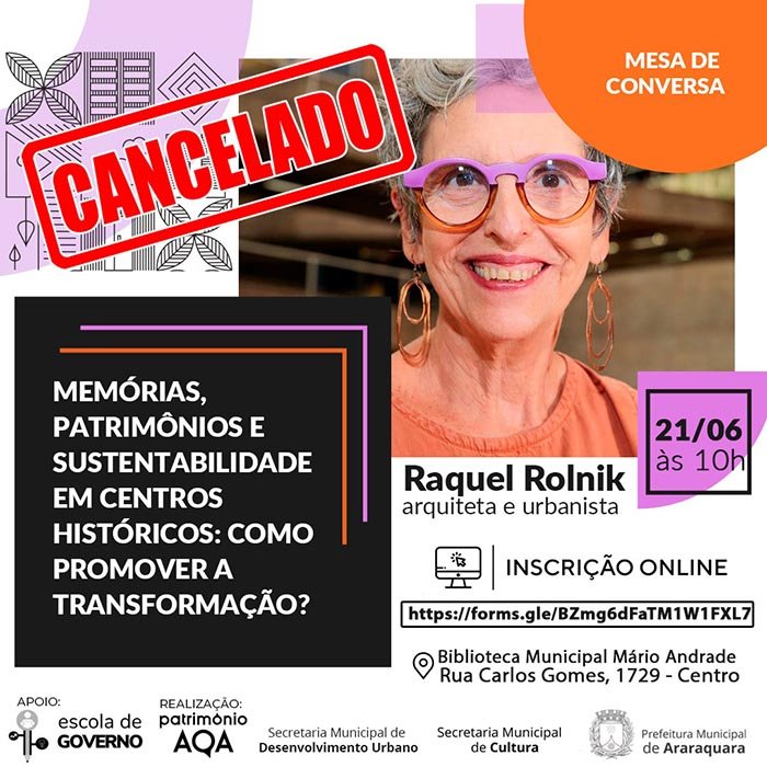 A urbanista e arquiteta Raquel Rolnik cancelou a vinda dela a Araraquara nesta semana. Por motivos pessoais, a professora titular da Faculdade de Arquitetura e Urbanismo da USP e prefeita do campus da Universidade de São Paulo adiou a visita na qual realizaria a mesa de conversa “Memórias, patrimônios e sustentabilidade em centros históricos: como promover a transformação?”.