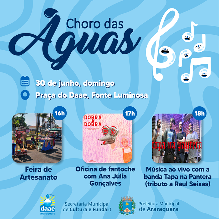 Raul Seixas ganha tributo especial neste domingo, 30 de junho, no Choro das Águas: a banda Tapa na Pantera é a convidada da Secretaria Municipal da Cultura e Fundart para o programa realizado na Praça do Daae – Fonte Luminosa. A programação apresenta ainda: feira de artesãos e empreendedores e oficina de fantoche com Ana Júlia Gonçalves.