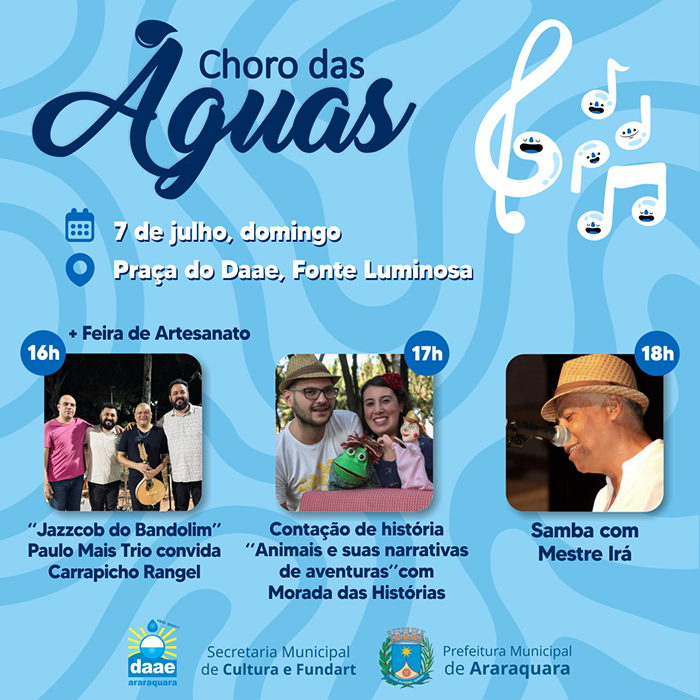 O Choro das Águas deste domingo, 07 de julho, chega com diversas atrações, sendo duas delas musicais, com chorinho e samba. A programação começa às 16h com a Feira de Artesanato e o show musical de chorinho “Jazzcob do Bandolim”; depois às 17h é a vez da contação de histórias “Animais e suas narrativas de aventuras!”, com Morada das Histórias e, por fim, às 18h tem “Samba Autêntico” com Mestre Irá. A programação realizada pela Secretaria Municipal da Cultura e Fundart é gratuita.