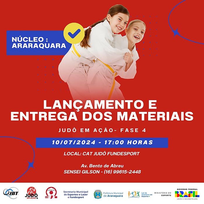 Na próxima quarta-feira (10), às 17h, o núcleo de Araraquara do Projeto Judô em Ação realizará um encontro de lançamento e entrega dos materiais. O evento será realizado no Centro de Treinamento do Judô, com entrada pela Avenida Engenheiro João Luís Molina Gil, na lateral do Gigantão, e setor de visitantes do Estádio Fonte Luminosa.