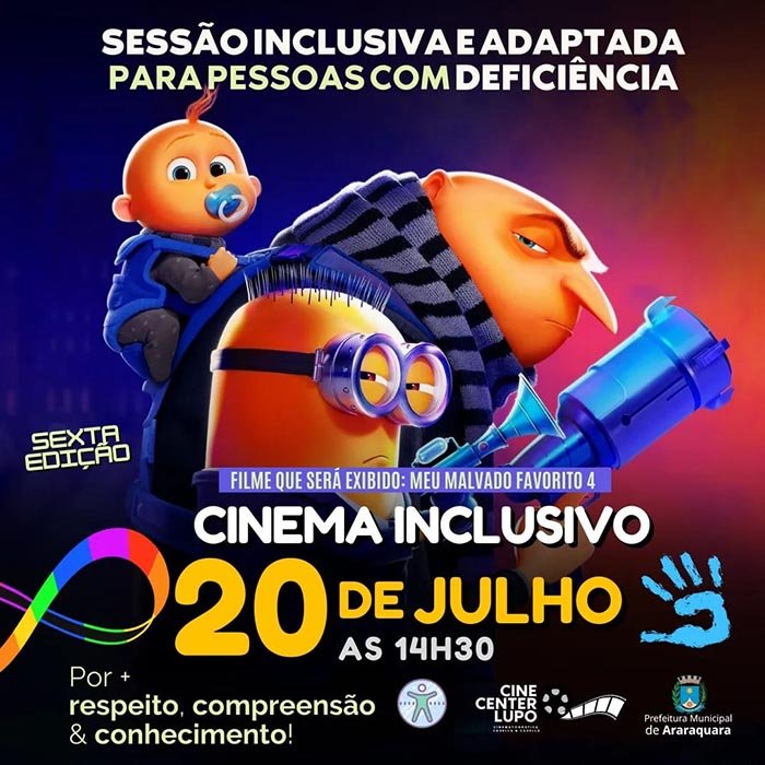 Tem “Cinema Inclusivo” neste sábado (20), no Cine Center Lupo, com exibição da animação “Meu Malvado Favorito 4”, às 14h30. Esta sessão de cinema é adaptada às pessoas com transtorno do espectro autista, síndrome de Down ou outras síndromes que acarretem hipersensibilidade sensorial em geral.