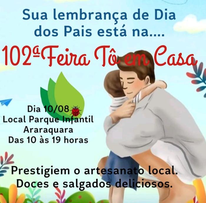 Neste sábado será realizada mais uma edição da Feira Tô em Casa, no Parque Infantil, das 10h às 19 horas, reunindo um time de expositores com artesanato e praça de alimentação com opções para presentear no Dia dos Pais.