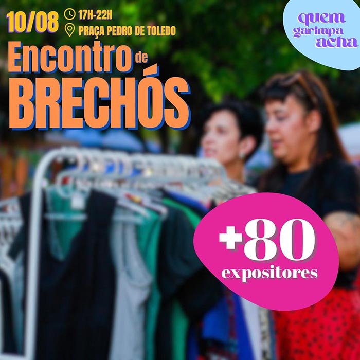 No sábado, das 17h às 22h, o Dia dos Pais é o tema do Encontro de Brechós, realizado pelo Coletivo Quem Garimpa Acha, na Praça Pedro de Toledo, das 17h às 22h, com mais de 80 expositores. O Encontro de Brechós é uma grande feira de brechós e moda circular e sustentável, levando a oportunidade de se vestir e presentear de forma mais sustentável, com expositores que destacam os brechós e as marcas de upcycling de Araraquara e região.