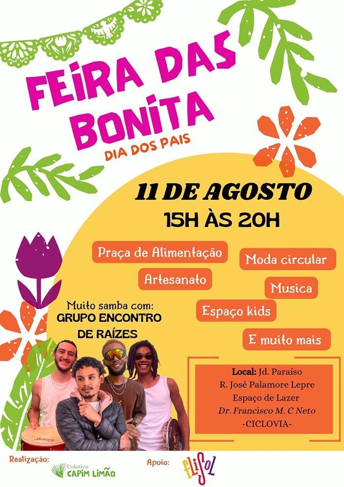 A feira cultural e gastronômica reúne samba, artesanato, área kids, moda circular e praça de alimentação, em uma realização do Coletivo Capim Limão. Vale destacar o apoio da FliSol – Festa Literária da Morada do Sol nesta primeira edição da Feira das Bonita, com a apresentação da atriz Nerita Pio em “Barangandão” com contação de história e atividade de confecção do brinquedo “barangandão”.