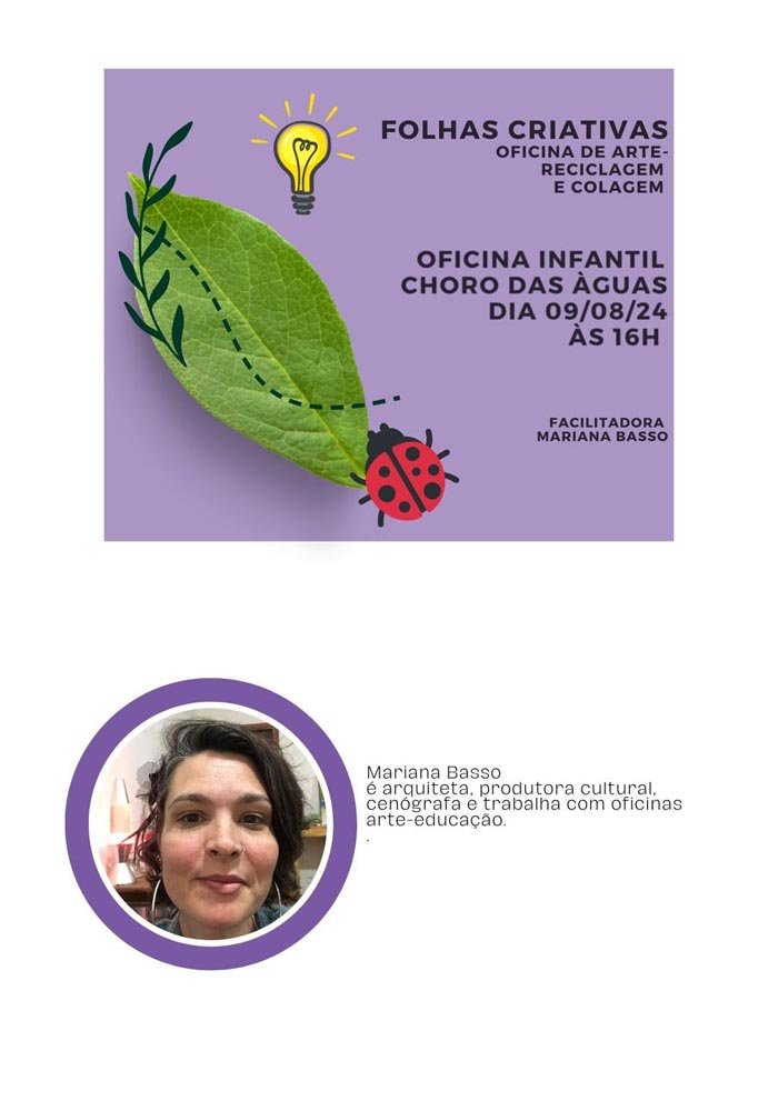 Neste domingo a programação do Choro das Águas, realizada pela Secretaria Municipal da Cultura e Fundart, tem início às 16 horas na Praça do Daae – Fonte Luminosa. A programação gratuita apresenta: feira de artesanato e oficina infantil de arte “Folhas Criativas”, com Mariana Basso, às 16h; e na sequência, às 17h, a contação de histórias “Amoras”, com Luana Guimarães.