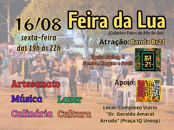 Na sexta-feira ainda tem, das 19h às 22h, a Feira da Lua na Praça do IQ - Instituto de Química da Unesp, com artesanato, gastronomia, brechó, em uma realização do Coletivo Pôr do Sol, com apoio da Prefeitura de Araraquara e da Taberna Augustina.