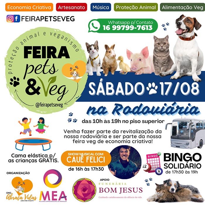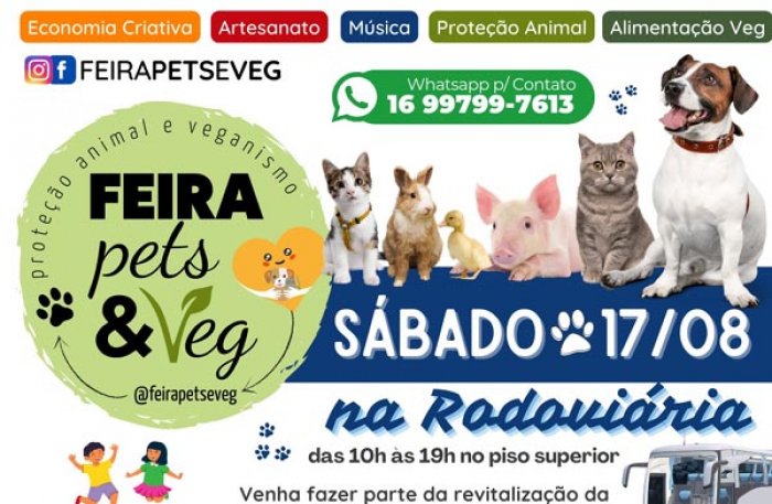 A Feira Pets & Veg realiza mais uma edição neste sábado, no saguão superior da Rodoviária, das 10h às 17 horas, com organização da ONG Abraça Vidas Araraquara e o apoio da Prefeitura de Araraquara.