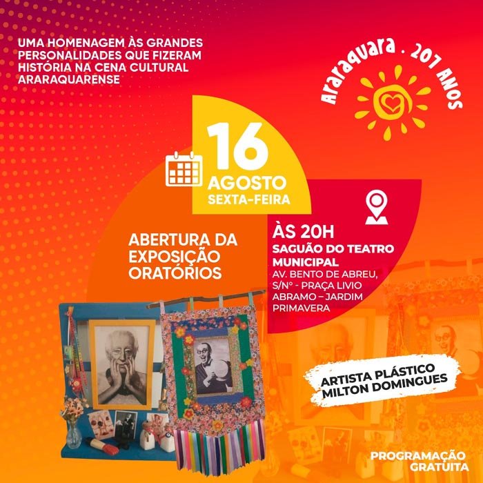 A exposição “Oratórios”, de Milton Domingues Junior, terá sua abertura nesta sexta-feira (16), às 20h, no Teatro Municipal de Araraquara. A atividade tem o apoio da Secretaria Municipal da Cultura e faz parte da programação oficial dos 207 anos de Araraquara, realizada pela Prefeitura de Araraquara.
