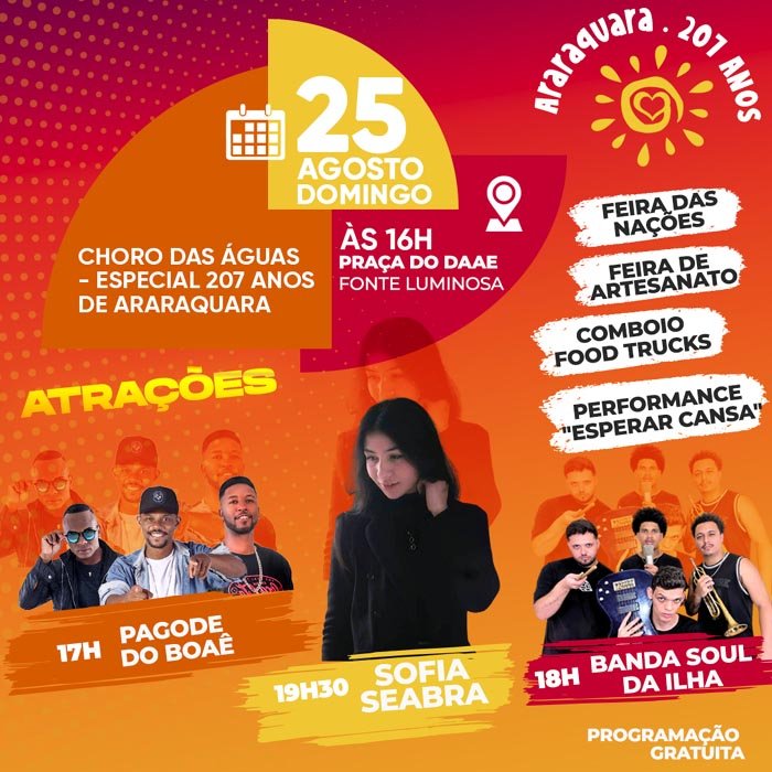 O encerramento da programação especial do Choro das Águas no aniversário dos 207 anos de Araraquara, no domingo reúne a partir das 16h: Feira de Artesanato, Feira das Nações e Comboio Food Trucks, além de três atrações musicais e performance: Pagode do Boaê, Soul da Ilha e Sofia Seabra, e a performance “Esperar Cansa”.
