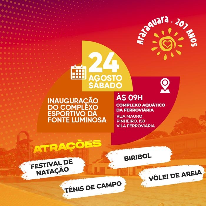 O esporte ganha destaque na programação de aniversário de Araraquara com a inauguração das obras de revitalização do Complexo Esportivo Municipal da Fonte Luminosa e a homenagem ao nadador e campeão mundial Antonio Carlos Orselli. A Marcha para Jesus, evento aguardado pela comunidade cristã, também será realizada no sábado. O Choro das Águas Especial é outra atração, com Feira de Artesanato, Feira das Nações e Comboio Food Trucks e recreação infantil.