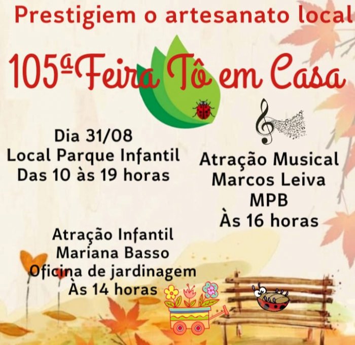 Neste sábado será realizada mais uma edição da Feira Tô em Casa no Parque Infantil, das 10h às 19 horas, reunindo um time de expositores com artesanato, praça de alimentação, música e oficina para crianças. Realizada pelo Coletivo Tô em Casa, com o apoio da Prefeitura de Araraquara - por meio da Secretaria de Trabalho, Desenvolvimento Econômico e Turismo (Coordenadoria de Economia Criativa) e Secretaria Municipal da Cultura e Fundart – a feira tem acesso livre.