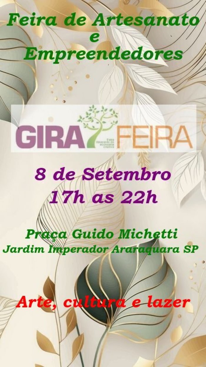A GiraFeira pela primeira vez chega à Praça Guido Michetti, no Jardim Imperador. A feira começa às 17h e segue até as 22h com expositores de vários segmentos. O artesanato é o carro-chefe da feira, com diversos produtos artesanais para presentear e decorar o lar, além de saboaria, perfumaria, produtos para pet – entre outros. Delícias de salgados e doces incrementam o cardápio da alimentação. Vale lembrar que a Praça Guido Michetti fica próxima à Igreja Sagrada Família, no Jardim Imperador.