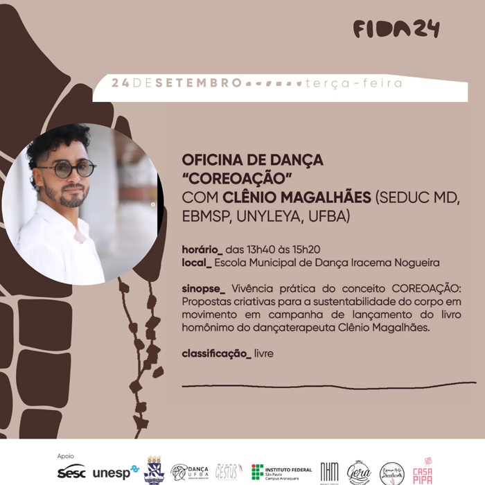 A Oficina de Dança “CoreoAção”, com Clênio Magalhães, será das 13h40 às 15h20 na Escola Municipal de Dança Iracema Nogueira (EMD). Nesta vivência prática, é apresentado o conceito “coreoação”, com propostas criativas para a sustentabilidade do corpo em movimento. Também, o dançaterapeuta Clênio Magalhães lança o livro homônimo.