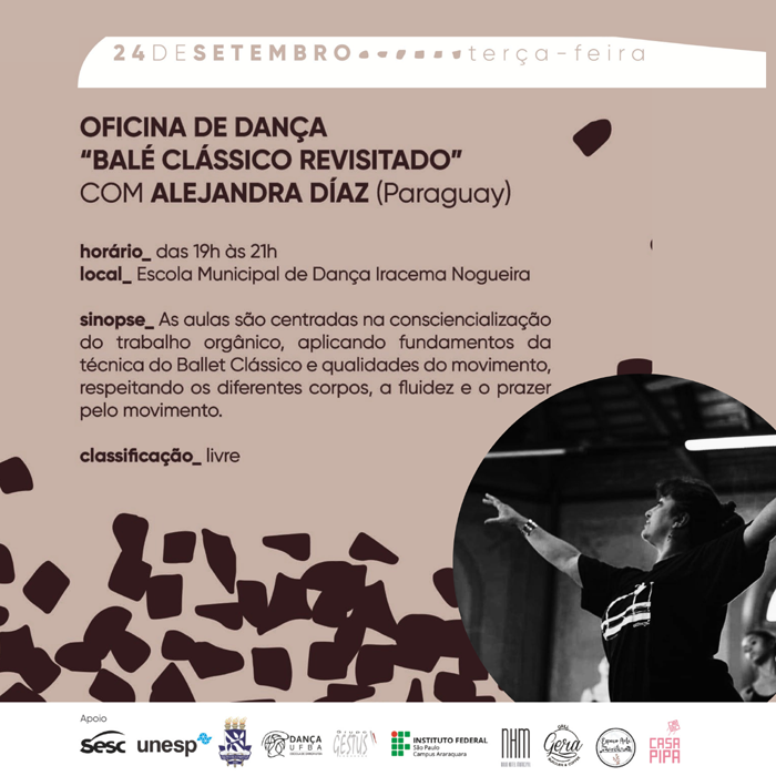 19h às 21h: Oficina de Dança “Balé Clássico Revisitado”, com Alejandra Díaz (Paraguay)