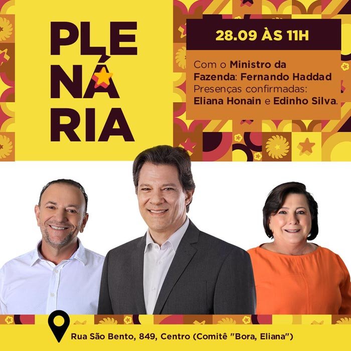 Neste sábado, dia 28 de setembro, às 11h, Eliana Honain, candidata à Prefeitura de Araraquara, estará presente em uma importante plenária que contará com a participação do Ministro da Fazenda, Fernando Haddad. O evento, que ocorrerá no novo comitê "Bora Eliana" (Avenida São Bento, 849, Centro), reunirá lideranças locais e regionais para discutir questões econômicas e sociais cruciais para o desenvolvimento de Araraquara e região.